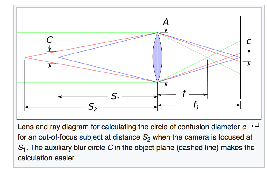 The Blur Circle, of diameter C, in the focused object plane at distance S1, is an unfocused virtual image of the object at distance S2 as shown in the diagram. It depends only on these distances and the aperture diameter A, via similar triangles, independent of the lens focal length: